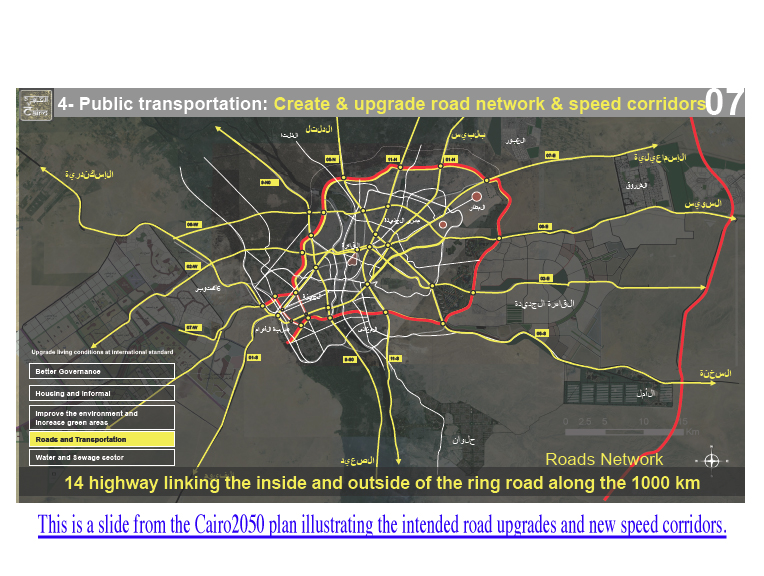 … from tunnels and overpasses, to buses and metro lines, to establishing more isolated, gated communities.”* Yahia Shawkat, an architect and researcher on urban policy, argues that developing a more efficient and extensive public transportation system is the only real solution; he asserts that widening roads is too expensive and creating tunnels and overpasses will increase pollution and ruin the aesthetic of the city.