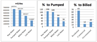 تحليل الأرقام الواردة أعلاه تبين أن المياه غير-الراجعه(المفقوده) تقدر بحوالي 36٪ وللأسف، هذه الكمية لا تقوم على قياسات حقيقية للتمييز بين الخسائر الحقيقيه الظاهره وبالإضافة إلى ذلك، فإن تصنيف المياه المستحقة على الفئات الثلاث الرئيسية السكنية والتجارية، والحكومية: يستند فقط على بيانات قديمة وغالبا لا يتم تحديثها.
