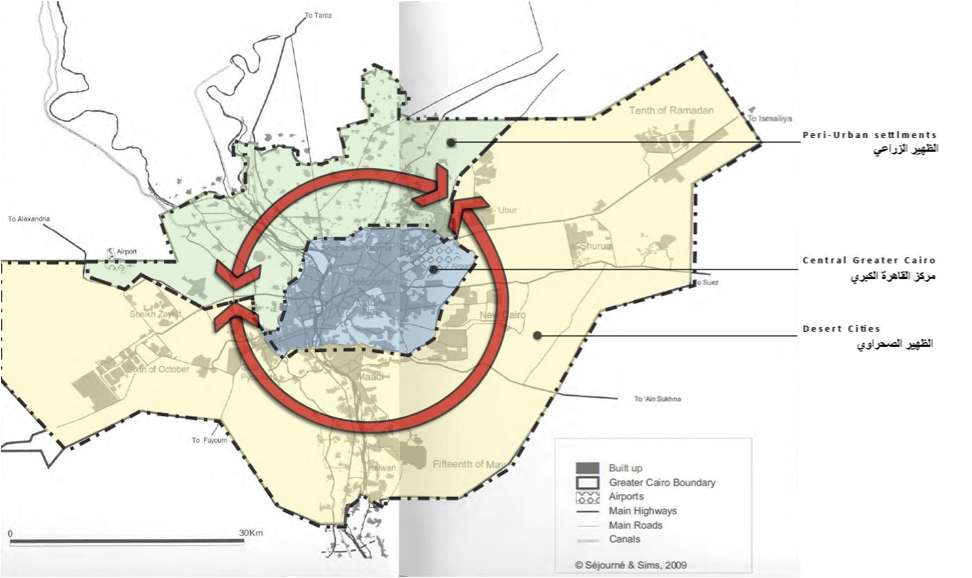 A diagram showing the peripheral urbanization around the central region of greater Cairo